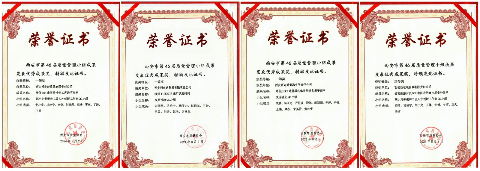 此次荣获西安市QC和质量信得过班组发布会多个荣誉,是西电避雷器发展历程中的一个重要里程碑。公司将继续秉承“质量第一、用户至上”的经营理念,孵化出更多的优秀QC成果和质量信得过班组,不断深化质量管理和班组建设,为客户提供更加优质的产品和服务,持续提升顾客满意。