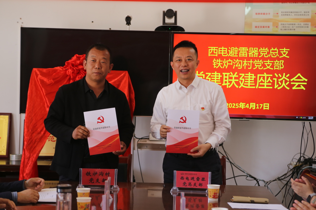 西电避雷器党总支与麟游县九成宫镇铁炉沟村党支部开展党建联建活动。西电避雷器党总支书记与铁炉沟村党支部书记签订《党建联建共建协议书》,为联建活动揭牌。双方围绕党建引领、资源共享、发展共谋开展座谈会,中共县委副书记山高飞,中共麟游县县委常委、副县长李凯,西电避雷器党总支书记、董事长、总经理何强,西电避雷器党总支纪检委员、工会主席、副总经理张苗,麟游县万家城驻村书记胡博及相关人员参加联建座谈。